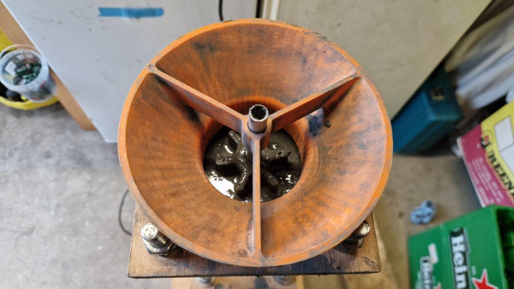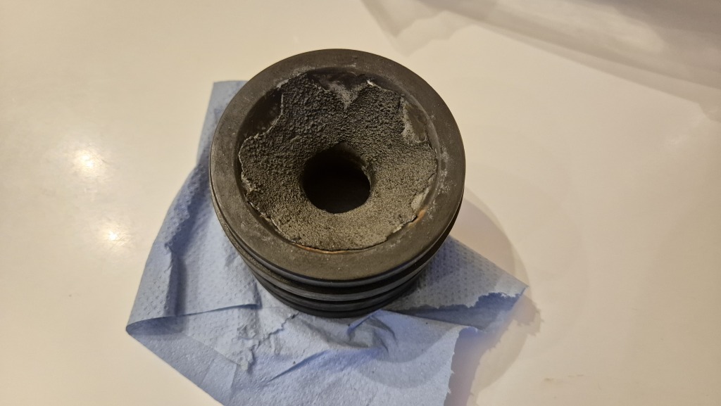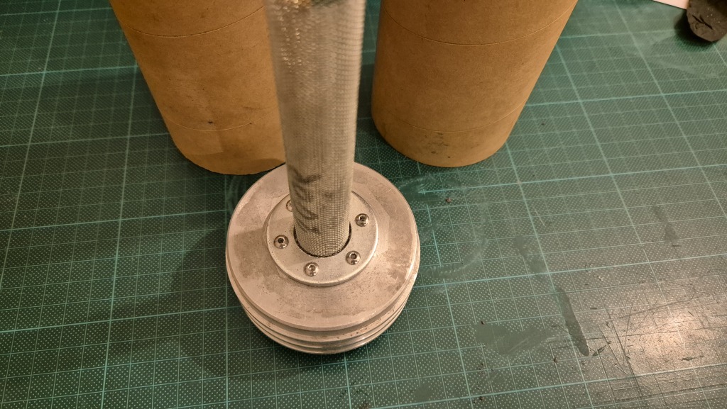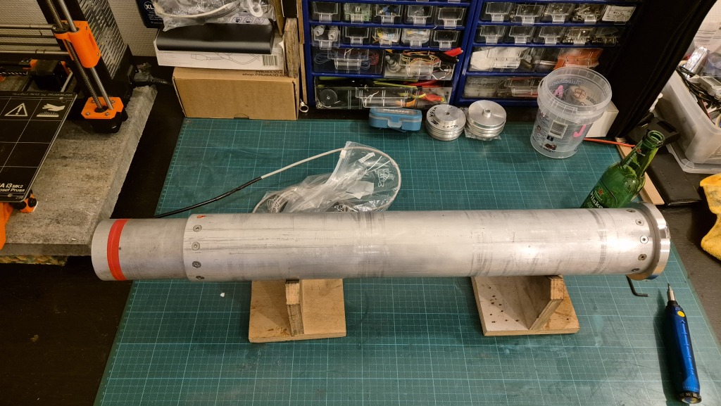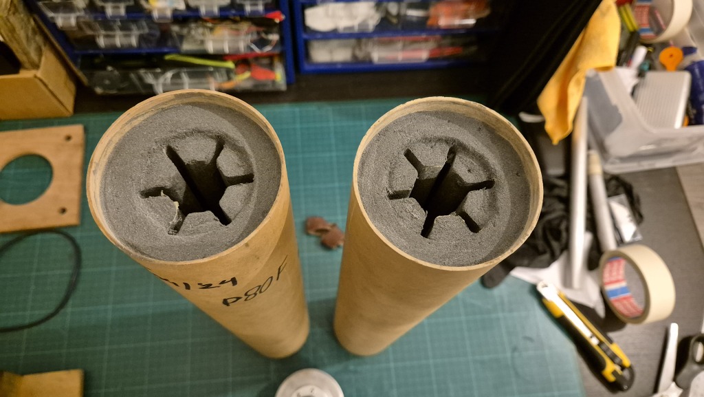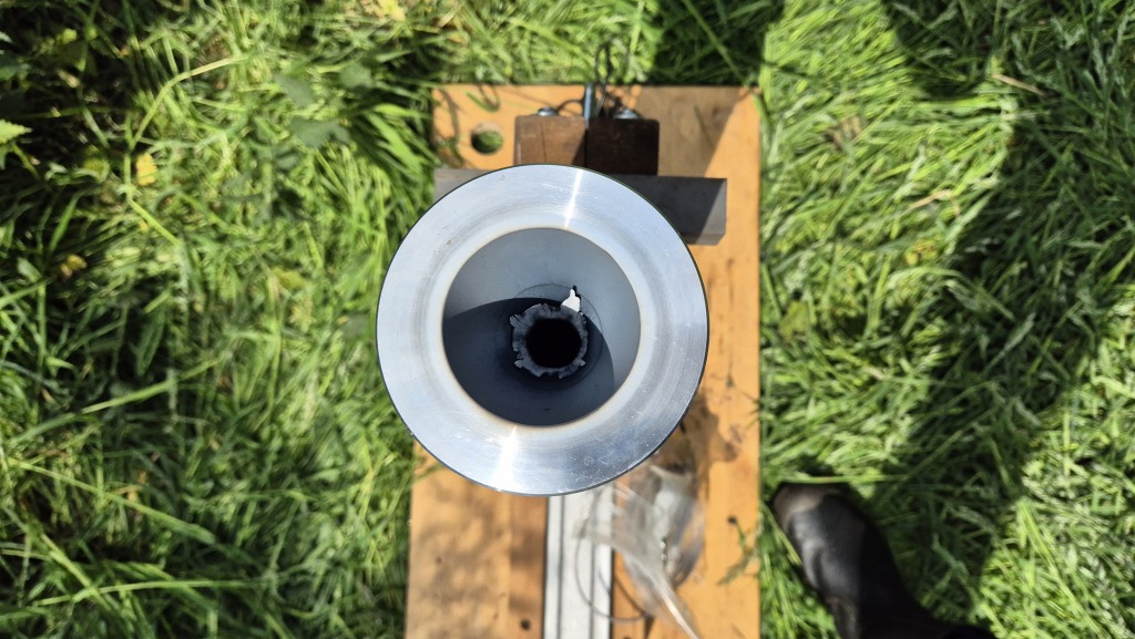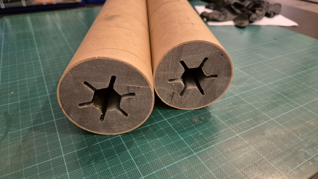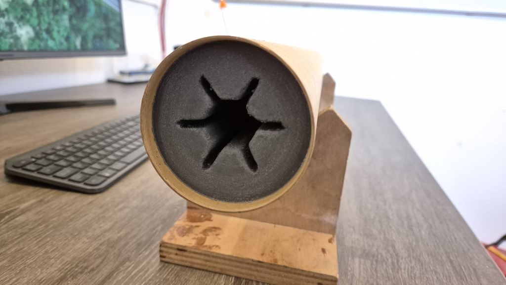 After a 3 year break, where I got distracted from rocketry (but never completely left the hobby), it was time to repair the damaged Intimidator 5. During the last flight in 2021 the motor eyebolt twisted loose and the fincan separated from the rest of the rocket under main parachute. As a result the fincan tumbled in a free fall from 300m and 'landed' in the heather breaking a fin. The fin was epoxied back into place with "Wildman style" injected fillets and additionally all 3 fincan cavities were filled with 2-component PU foam for extra rigidity.